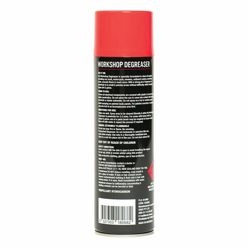 Look no further, SCA aerosol workshop degreaser makes quick work of it. This multi-purpose degreaser helps by breaking the bond between the surface and the contaminant, allowing them to be easily washed away with water. This large 400g aerosol can creates a strong jet of degreaser, great for dislodging contaminants in hard to reach areas; simply spray onto the surface, let soak and hose off. For super stubborn grease or old driveway stains multiple applications and agitation in the form of a brush, cloth or pressure washer can aid in speeding up the process.